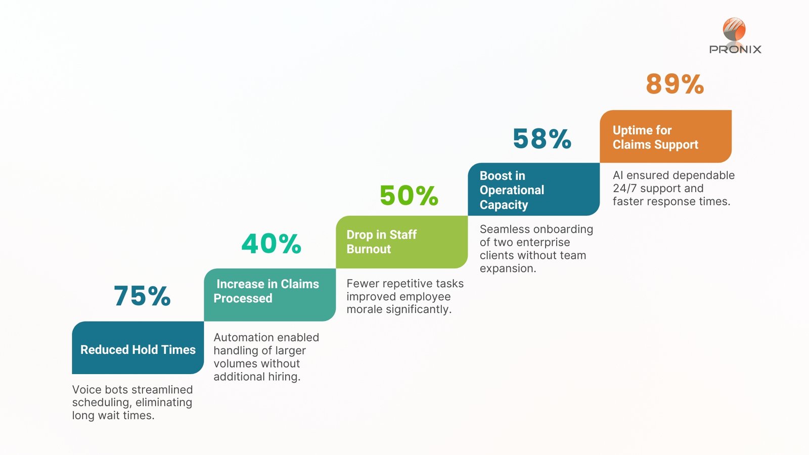 Pronix Inc. implemented a voice-enabled AI automation framework to transform the claims interaction process. The solution eliminated the need for staff to manually call carriers by automating inbound and outbound claim/payment status interactions via intelligent voice systems. It also enabled omnichannel access for real-time status updates across web and mobile touchpoints.